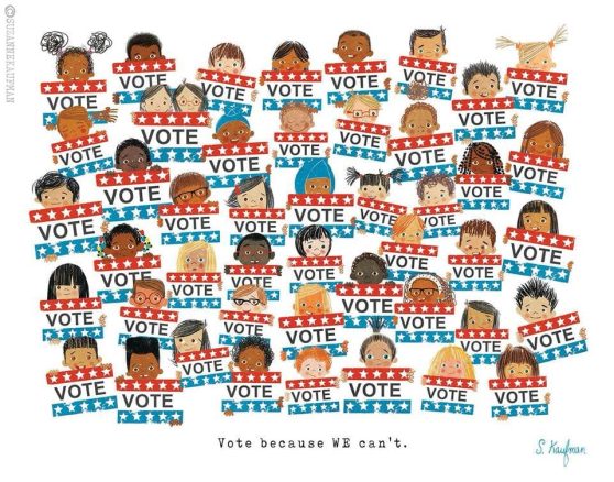 The text at the bottom of her illustration of kids holding “VOTE” signs says, “Vote because we can’t.”